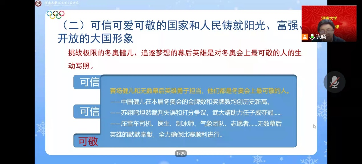 接着,陈旸从民族复兴的缩影、大国形象的树立、中国理念的实践、文化自信的彰显、体育精神的践行等五个方面对学生进行了教育引导。从奥运三问到双奥之城是民族复兴的缩影,“大国之言,出而必行”是大国形象的树立,奥运精神与中国理念共鸣是中国理念的实践,文化之美与时代精神交融是文化自信的彰显,做新时代的追梦人是体育精神的践行。他讲到,冬奥会的成功举办彰显制度优势、大国担当,党中央始终关心北京冬奥会筹办工作,党和人民给予了冬奥会强大的物质和精神支持;奥运格言108年来首添新内容,在“更高、更快、更强”的基础上,增加了“更团结”,这不仅顺应时代,而且表达了回归初心的根本目标;北京冬奥会主题口号“一起向未来”传递了构建人类命运共同体的中国主张。他渊博的知识、幽默风趣的话语引来学生一阵阵的点赞。