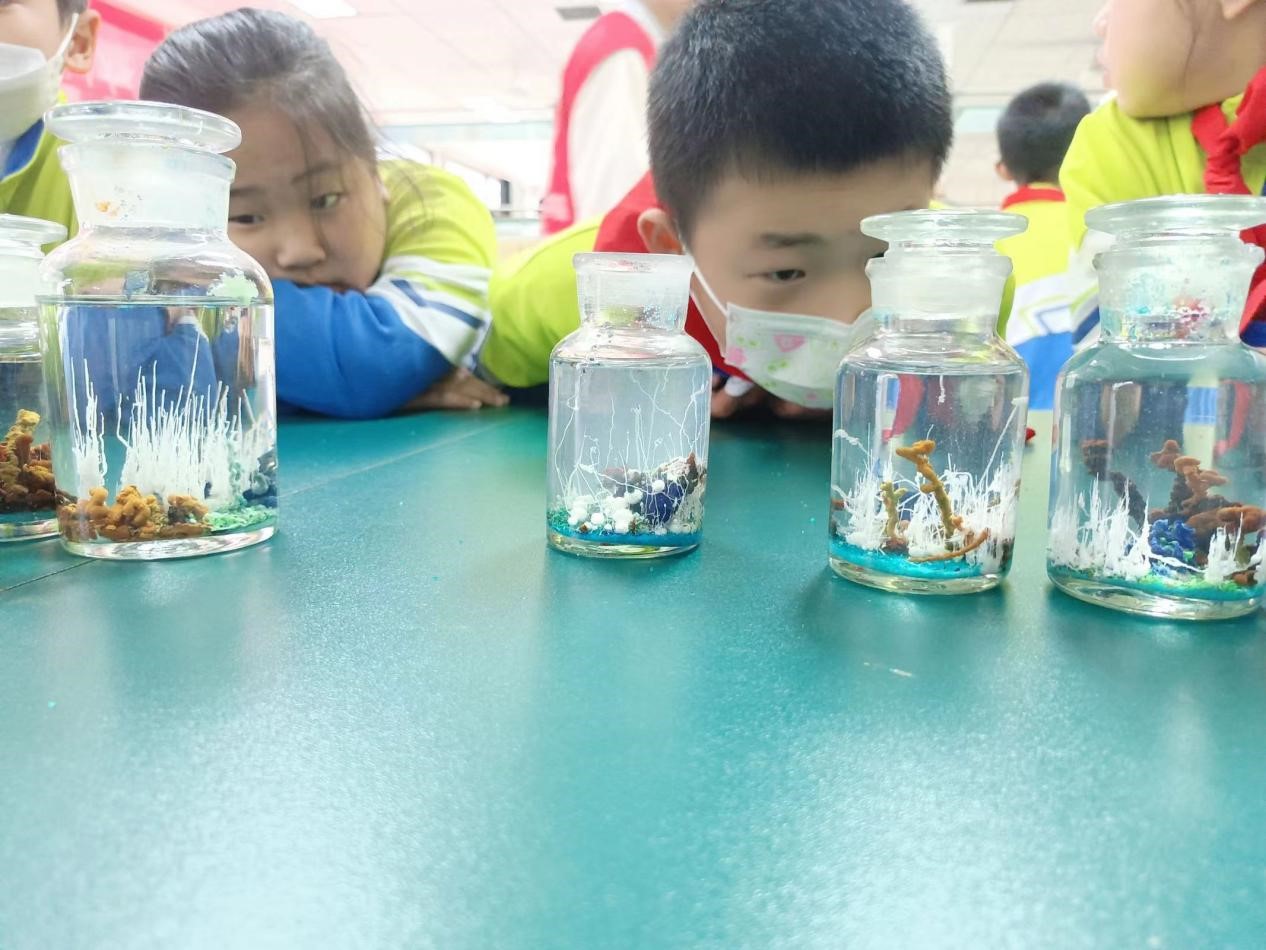 小学生们被分为六组,轮流做6个化学科普小实验:水中花园、大象牙膏、点水成冰、写密信、跳动的葡萄干和紫色玻璃罩。基础实验中心董青松、李杰、田淑芳三位老师先进行讲解示范,小朋友们被奇妙的实验现象深深吸引。他们认真观察,积极与老师互动,细心缓慢地进行实验操作,惊讶于化学实验的神奇。老师们也惊喜于小朋友们对化学实验的探索与喜爱,耐心解答他们的疑问,认真指导他们的操作。在本次科普活动中,小朋友们从有趣的化学实验中学习到了氧化还原、酸碱中和等化学知识。实验结束,大家进行合影留念,每个小朋友都收到了Porn87