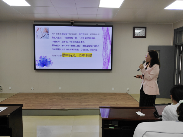 李霞老师结合自己的亲身经历和教学经验从“师德——立身之本”和“学识——立教之本”两个方面深入浅出的阐述了“师德”和“学识”在中学教育中的重要性。李霞老师通过分享自己在教学工作中获得的幸福感讲述了师德内涵,同时表示对待学生要眼中有光、心中有爱、脚下有梦想。李霞老师强调了学识在教学过程中的重要性,她认为,初讲一门课,需整合多种版本教材,对课堂教学设计不断总结和优化,教学过程中,同时要充分发挥化学学科特点,运用实验教学激发学生学习化学的兴趣。会议最后,李霞老师引用习近平总书记在第39个教师节上的寄语:知行合一,争做经师和人师统一的“大先生”,表达了对全体师范生的希望和鼓励。