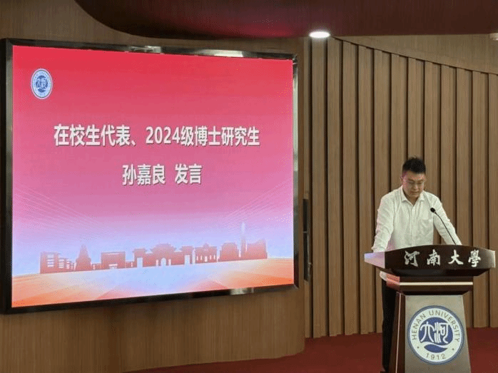 的志向。她真诚希望同学们将个人理想与国家发展紧密相连,把自己的“小我”融入祖国的“大我”之中,祝福同学们在追逐梦想的路上,既有乘风破浪的勇气,也有脚踏实地的坚定。在校生代表、2024级博士研究生孙嘉良向同学们介绍了学院的科研平台和设施,并结合自己的切身体会,围绕科研与成长方面建议大家要夯实基础、潜心钻研;善用平台、拓展视野;心怀责任、共同成长。他祝愿大家既能沉心于实验桌前,探究分子之间的奥秘,也能放眼于社会未来,书写属于自己的精彩篇章。