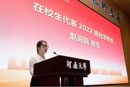 曾荣获国家奖学金、国家励志奖学金、多项学科竞赛国家级奖项以及“三好学生”等多项荣誉称号的2022级化学专业二班的赵迎丽,作为高年级学生代表发言。她回顾自己大学三年在实验室钻研、参与创新项目和竞赛等经历,分享成长感悟。并对新生提出三点建议:明确目标、做好规划;走出舒适圈、在历练中成长;涵养积极心态。最后,祝愿新生在河大书写无悔青春。