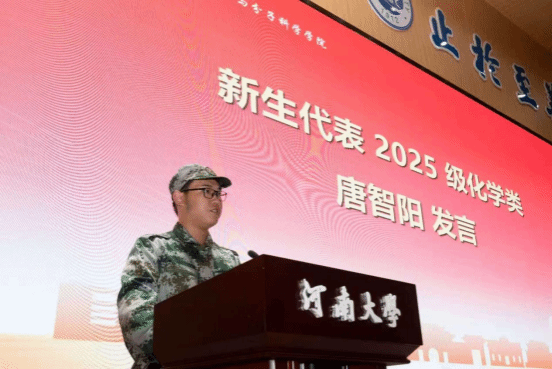 2025级新生代表唐智阳发言时,首先向父母、师长与同学表达敬意与感谢。随后浅谈“明德新民,止于至善”校训和“自信、拼搏、开放、创新”新河大精神对他们大学生活的引领和指导意义,并表达了与同学们共同成长成才的期待。最后他代表新生表态,他们已做好迎人生新阶段准备,要争做时间的雕刻家、温暖的传递者、时代的答卷人,在大学期间砥砺前行、淬炼成长,书写青春华章。