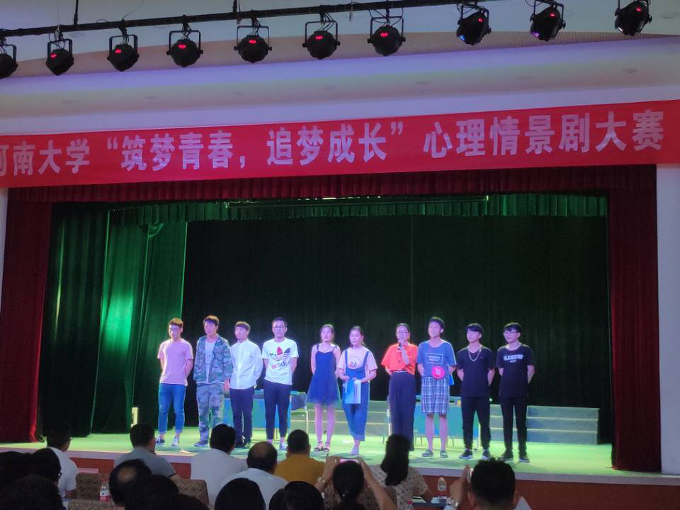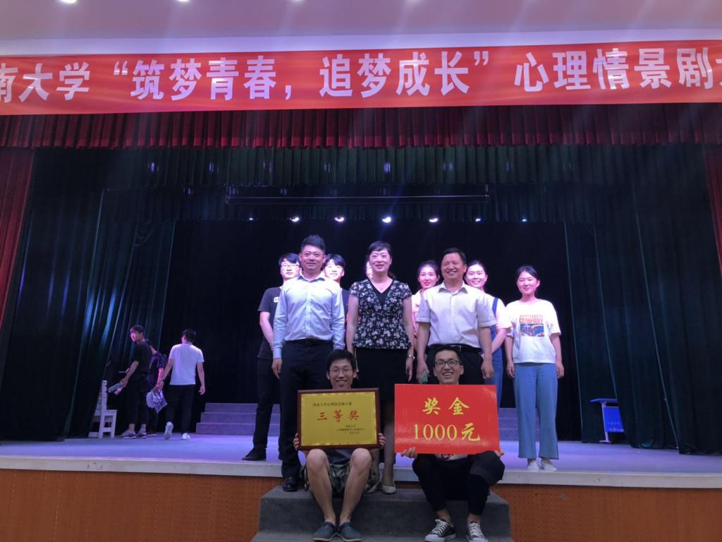 党委副书记马文海和心理工作站站长商华文对表演同学做了临时动员,并为他们加油鼓气。经过参演同学精彩的演绎最终荣获三等奖。比赛结束后,参演同学同领导、老师合影留念。