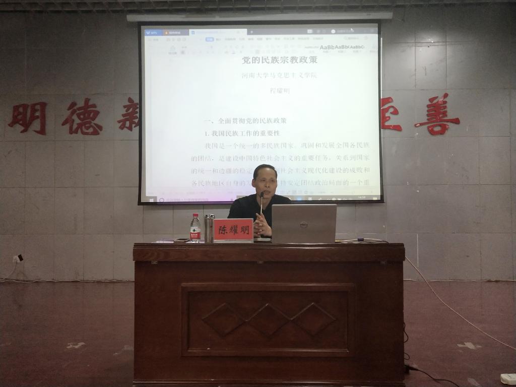 报告会开始,陈耀明首先从我国民族问题现状入手,指出开展相关民族工作问题的重要性。接着他提到党的民族政策,号召大家坚持民族平等与团结,积极树立民族共同体意识,增强对中华民族的自信心及自豪感。之后他讲述了党的宗教政策。最后他就生活中应如何对待各宗教的问题给出自己见解,并给大家分享日常言论行为注意事项。