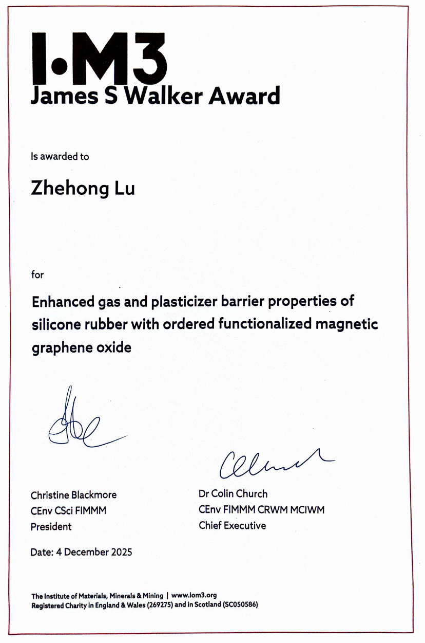 青年教师鲁哲宏在英国材料、矿物与采矿学会(IOM3,Institute of Materials, Minerals & Mining)年度奖项评选中脱颖而出,荣获 James S Walker Award。IOM3是英国重要的专业工程与科学机构之一,长期面向材料、矿物与采矿等相关领域开展学术交流、行业服务与专业发展工作。IOM3 作为注册慈善机构,并由英国皇家特许状(Royal Charter)治理,在国际材料与资源工程界具有广泛影响力与公信力。 James S Walker Award 是 IOM3 设立的奖项之一,聚焦聚合物(polymers)方向的项目/研究成果,用于表彰在该领域完成并通过评审的优秀项目。