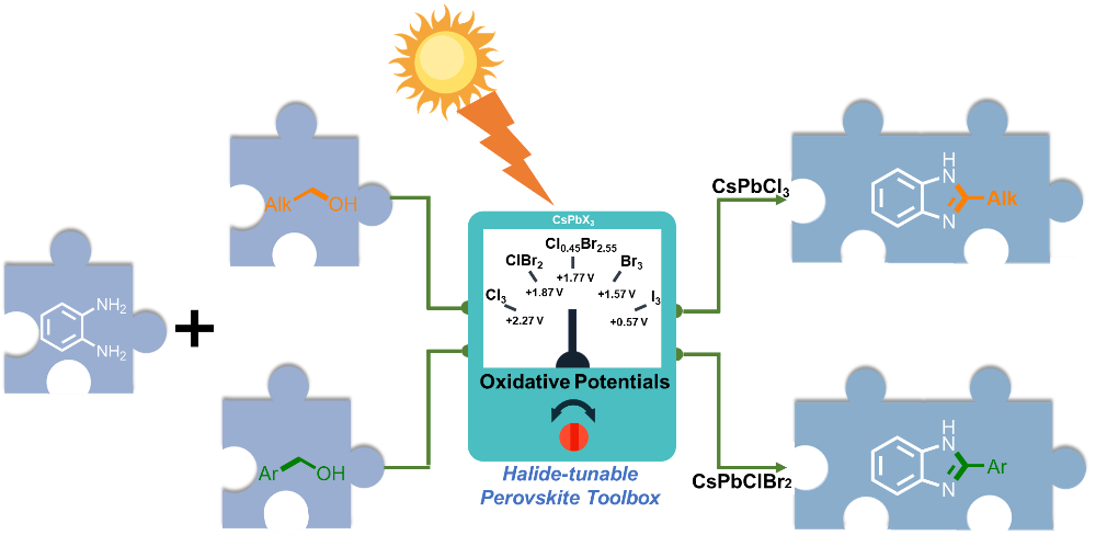针对这一难题,研究团队构建了一种“吸附偏好、卤素可调”的 CsPbX3(X = Cl/Br/I)钙钛矿纳米晶光催化剂工具箱。该策略的核心创新在于,通过调节卤素组成,同时调控催化剂的氧化能力与表面吸附行为,实现催化剂与不同类型伯醇底物的精准匹配。其中,CsPbCl3 在 405 nm 光照下适用于链状脂肪醇的氧化,CsPbClBr2 在 455 nm 光照下则更适合苄醇类底物。借助这一设计,研究团队在氧气参与的温和、非贵金属、非均相条件下,实现了伯醇到苯并咪唑的高效可见光转化;对于具有挑战性的线性脂肪醇,仅需当量醇底物即可完成反应。