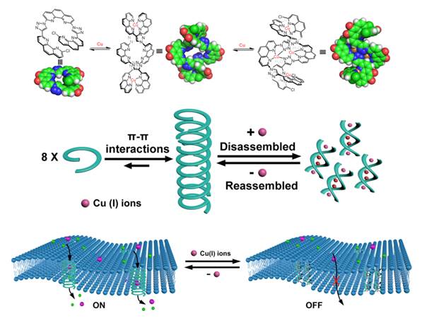 天然离子通道通过对外界刺激的响应实现离子可控、高效、选择性地穿过细胞膜产生化学信号或电信号,从而调节多种生理现象,影响细胞生命。然而,利用化学合成体系来构建人工离子通道并复制天然离子通道的功能仍面临巨大挑战。受天然KcsA K+通道的启发,朱俊彦博士精确设计了具有铜离子调控含孔道单螺旋和无孔道双螺旋互变行为的芳香螺旋寡聚物,利用具孔道单螺旋自发形成的一维自组装螺旋管,嵌入磷脂双分子层,展现了高效、稳定的离子通道性能。随后,通过铜离子配位与去配位诱导单双螺旋结构互变进而导致的自组装螺旋管的解组装和重新组装,实现了所设计离子通道的可逆关闭与打开。该工作首次利用单双螺旋结构互变,构建了第一例原位配体门控的可逆仿生离子通道,研究结果对于理解天然离子通道的行为机制具有重要的生物学意义,也为开发在生物学和医药学领域具有潜在应用的智能仿生纳米通道提供了全新的思路。Porn87