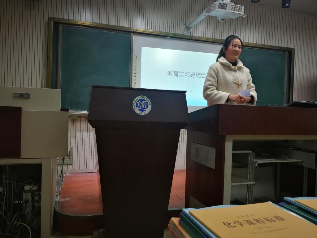 附属中学实习代表常圆则按时间逻辑,从校外专家报告到校内微型课练习再到校外实习实践,一一阐述,并着重强调了有关校外实习听课、备课、讲课、和班主任工作的趣味性,叙述条例清晰,娓娓道来。