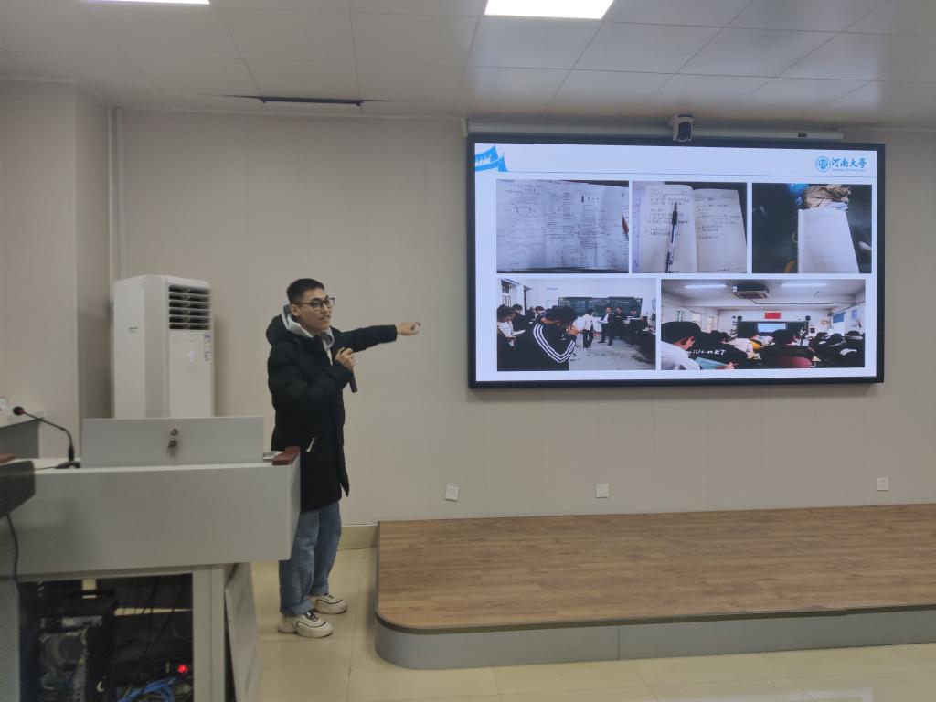 随后,本次实习的七个小组分别派出一位代表进行实习汇报。其中第一组代表胡佳琪从校内实习和校外实习两个方面展示了小组成员的实习成果,她强调教师成为教育研究者具有突出优势,一改之前的错误看法,体现出在实习过程中的辩证思考;第四组代表王江明以幽默生动的语言和真实有趣的事例,为同学们展示了在中牟县实习的工作生活,他围绕“凡事预则立,不预则废”的中心,指出了充分准备的重要性;第六组代表王宇轩从讲课和班级管理两方面介绍了自己的心得感悟,沉浸式讲课和走心式班级管理是他带班的“两大法宝”,他强调要尊重学生,不放弃每一个学生,同时要给学生留有神秘感。