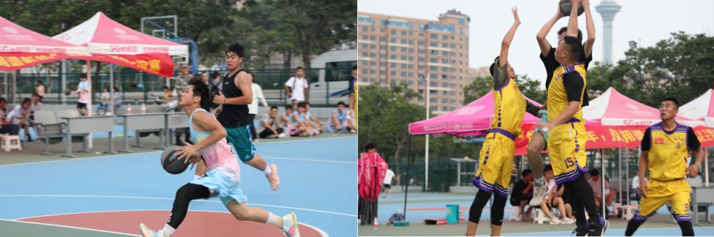 篮球队凭借跳球抢得先机,接着双方队员以矫健熟练的动作迅速传球,你争我夺、你攻我守,展开了一轮轮的投球。赛场上他们激情高涨,投球动作帅气利落,争夺异常激烈。场下观看同学呐喊助威,球场气氛十分活跃。