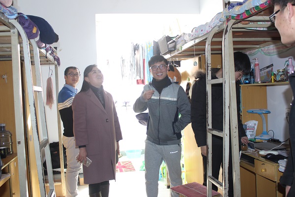 党委办公室主任兼2014级辅导员王路娟深入宿舍慰问学院学生,代表学院给学生们送去关爱。