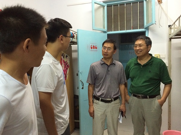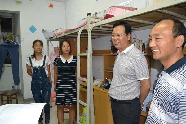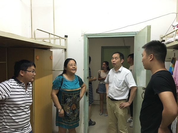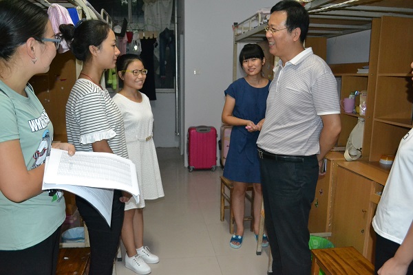 领导始终与志愿者们站在同一战线,亲临迎新工作站指导工作。在一天的辛苦工作后,各位领导仍不辞辛劳,亲访慰问每个宿舍的每位新生,以师长,更以朋友的身份与他们交谈,认真细致地询问新生们是否适应开封的天气,食堂的饭菜是否合口,对寝室的安排是否满意,与室友相处是否融洽等情况,对新生反映的各种问题他们更是耐心地聆听并给出宝贵意见,同时,叮嘱他们在生活、学习上有任何困难一定要及时向学院老师反映。