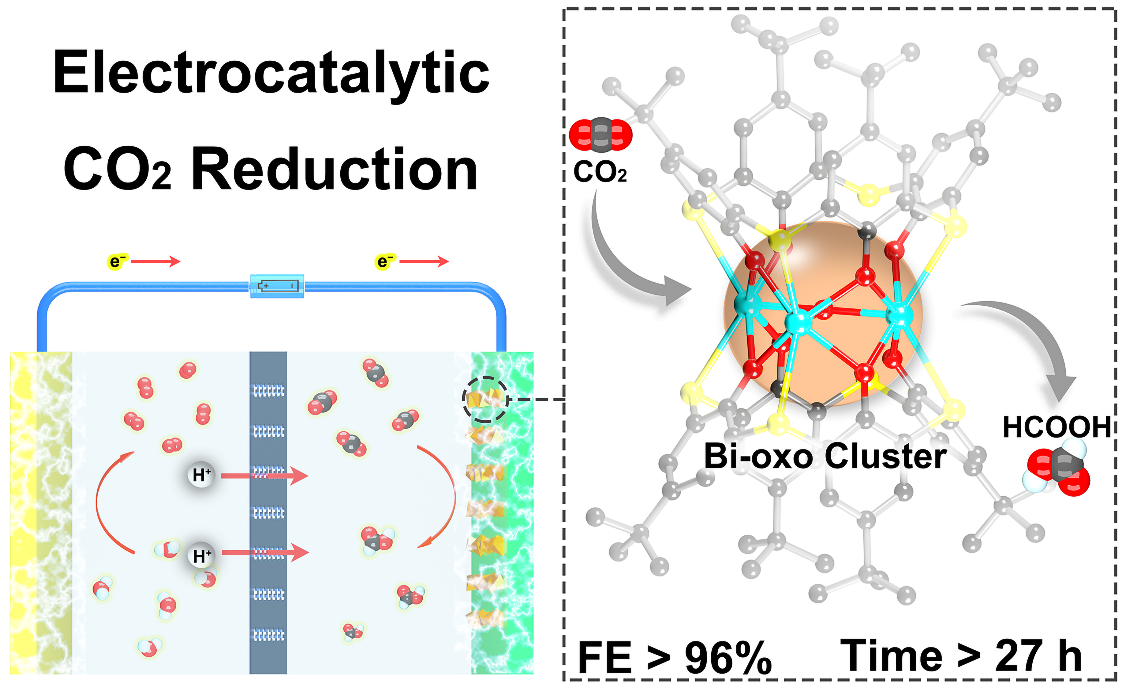 利用可再生电力将二氧化碳转化为高价值的燃料或化学品,被认为是缓解能源危机和温室效应的有效策略。在电催化二氧化碳还原反应(ECR)的液相产物中,甲酸无毒、稳定,在储存和运输方面有很大的优势,在储氢和燃料电池方面有广阔的应用前景。铋基纳米材料电催化剂对CO2转化为HCOOH具有较高的选择性和法拉第效率,但这类电催化剂由于其相对复杂的相和组分,往往缺乏明确的结构信息,难以确定其反应机制。因此,为了研究CO2到HCOOH的具体转化机制,必须设计具有明确活性位点的明确的电催化剂。