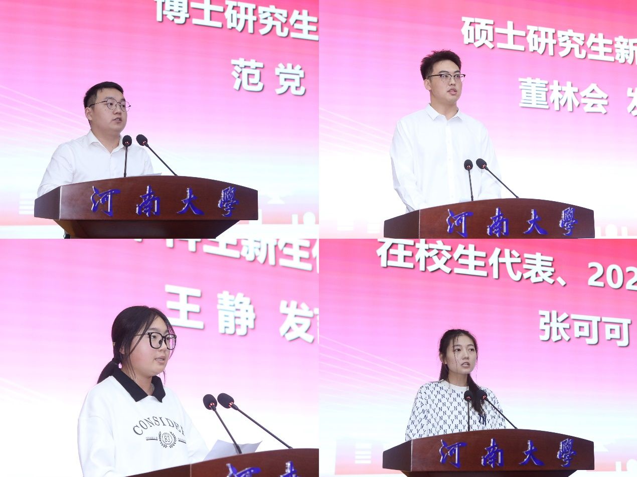 博士研究生新生代表范党表示,要发扬“自信、拼搏、开放、创新”新河大精神,坚持踏实奋斗,勇攀学术高峰。硕士研究生新生代表董林会表达了对未来的期许,将以饱满的热情和坚定的决心,进行深入探索与高层次追求。本科生新生代表王静分享了大学生活的感悟,强调了自律的重要性,倡议大家珍惜时光,用自律书写青春。在校生学生代表2023级硕士研究生张可可以自己的亲身经历为引,鼓励新生们珍惜大学时光,培养人格、锻炼能力,勇敢地去尝试、去挑战,为自己的人生打下坚实的基础。