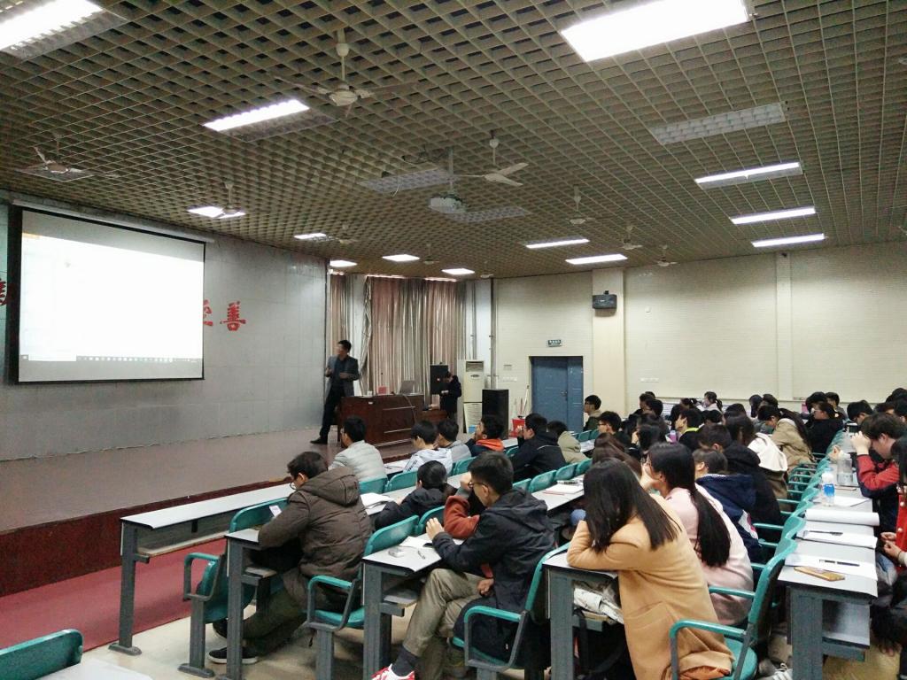 教师李庆华在化学化工学院报告厅举办化工设计竞赛演讲,参赛队伍聆听此次演讲。