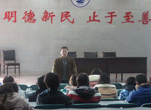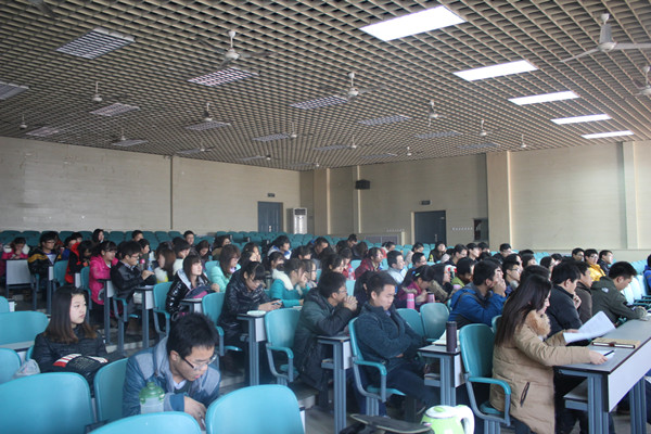 材料系主任丁涛在此作“大三学生考研与就业答疑解惑”的讲座,11级辅导员王路娟携该全年级学生到场聆听。