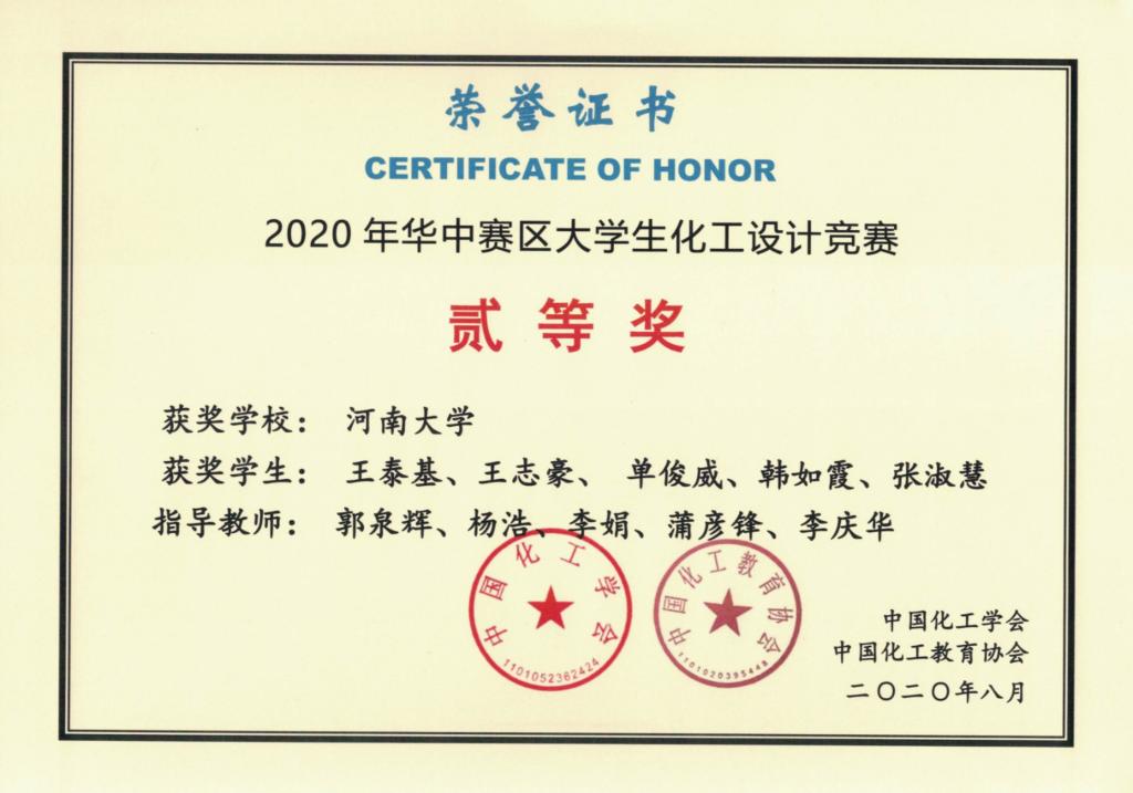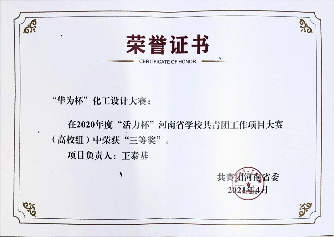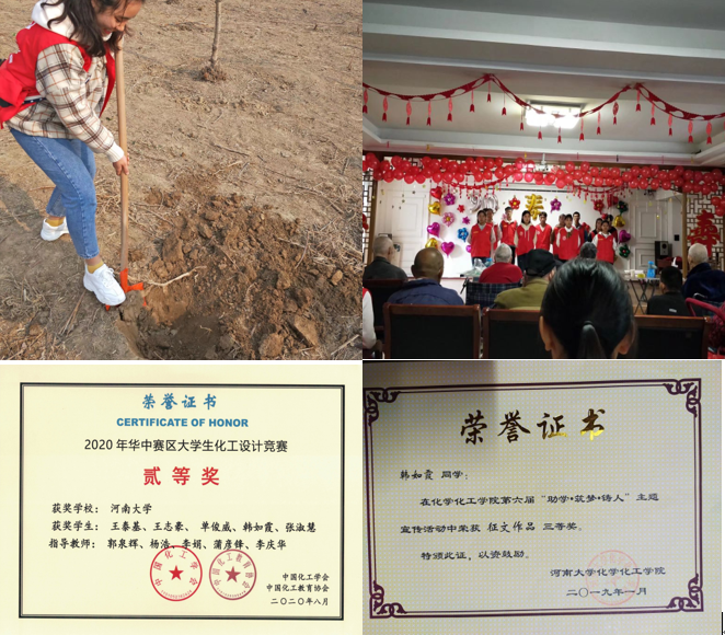 优秀社团干部”等4项荣誉称号,以及全国大学生化工设计竞赛华中赛区二等奖、“活力杯”河南省学校共青团工作项目大赛三等奖等3项省级及以上奖励。