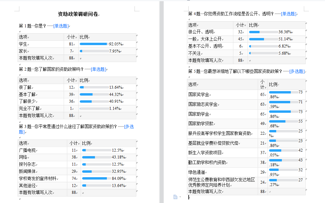 据统计,该问卷调研总共收集了88份结果,其中学生81份,家长7份。根据调研结果,队员们发现大多数学生和家长对国家的资助政策基本了解或了解很少,比较倾向于了解国家助学金、国家助学贷款、国家奖学金、新生入学资助项目以及勤工助学等资助政策。同时发现84%学生是通过学校寄发的宣传材料了解国家资助政策,一部分同学是通过网络和新闻媒体了解。