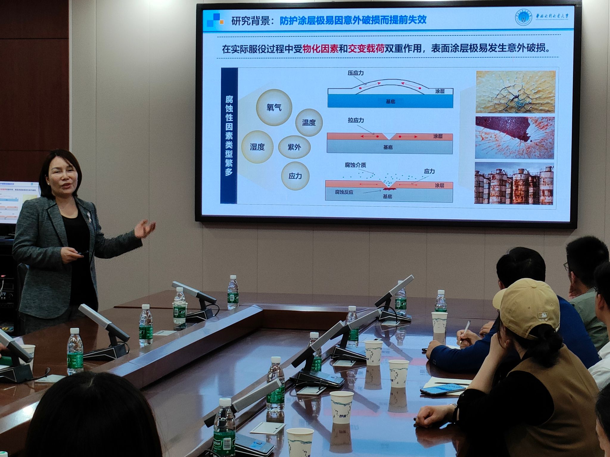 报告中,李伟华介绍了防腐涂层的重要意义。其研究团队针对传统微容器型自修复策略修复灵敏度低、环境响应时效性差的问题,利用腐蚀微环境诱因及变量作为触发因素,建立了基于微容器的涂层损伤即时高效自修复技术体系;为了改进微容器型自修复策略的“修复次数有限”,创新建立了固-液转变新型涂层损伤自修复技术体系,利用“流动性”与“稳定性”在涂层体系中的协调统一,实现了涂层本体损伤的可重复自修复。报告结束后,她与参会师生进行了深入交流,并全面回答了大家提出的问题。