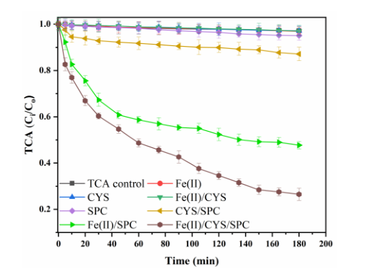 卤代烃被广泛用于精密机械、汽车、电子、纺织、制药、化工等行业,如1,1-三氯乙烷(1,1-TCA)、三氯乙烯(TCE)、、四氯化碳(CT)等。其中TCA是卤代烃化合物的主要代表,也是地下水有机污染的主要来源之一。原位高级氧化是采用特殊氧化体系直达地下水污染区域,进行低成本精准修复的一类方法。课题组通过将Fe(II)/CYS/SPC高级氧化体系用于水体TCA污染的修复工作取得了一系列重要成果,梳理了CYS、Fe(Ⅱ)和SPC在反应体系中的主要作用,分析了羟自由基与超氧化物自由基的发生机理,对体系的复用性和稳定性进行了验证,经四次循环后TCA降解率仍能达到68%,Fe(II)/CYS/SPC高级氧化体系可以作为地下水TCA污染修复的有效途径。