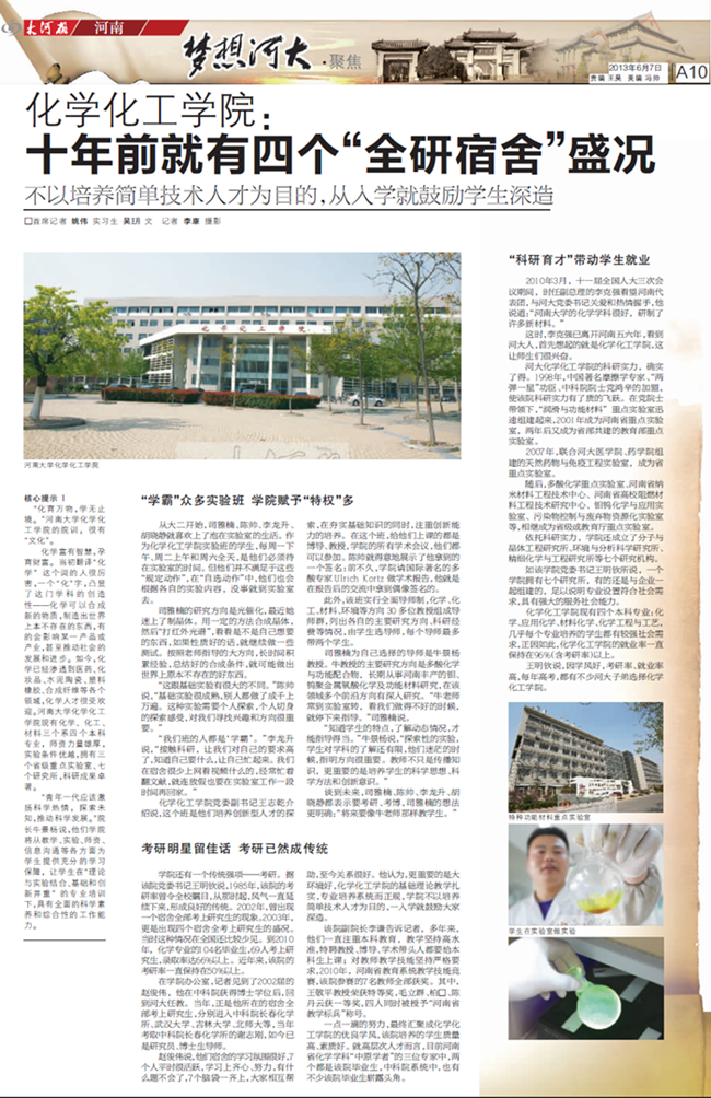 《大河报》化学化工学院:十年前就有四个“全研宿舍”盛况