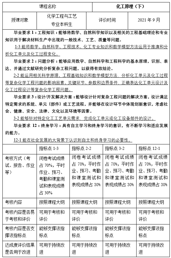 对照工程教育认证标准中的毕业要求,开展化工原理课程的课程体系与教学内容的研究与实践,采用以学生为中心,以成果为导向的化工原理教学改革实践活动,探索出一种创新的课程教学模式,提高工程人才的培养质量,保障化学工程与工艺等相近专业认证的顺利实施,促进我校应用化学、生物工程等相关专业认证的开展,推动高等院校工程学科各类课程在专业认证背景下的教学改革。