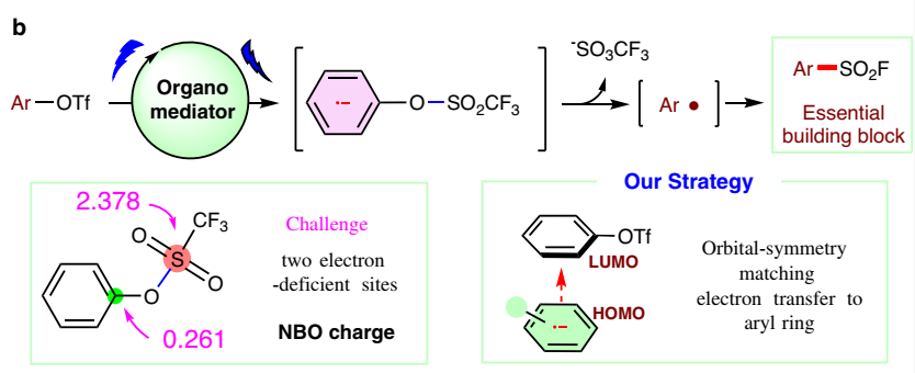 此外,该团队首次利用电化学策略,通过阴极还原芳基季铵盐以及噻鎓盐为芳基自由基中间体,顺利实现了芳基腈(Org. Chem. Front. 2022, 9, 1288)和磺酰氟(Org. Lett., 2023, 25, 581)的选择性创制新方法。最近,该小组利用有机媒介,成功实现了以芳基磺酸酯为底物并利用轨道匹配策略通过电子的选择性传递产生芳基自由基,并开发了通过大宗原料酚合成芳基磺酰氟的新方法与新策略,相关工作发表在国际著名期刊Nat. Commun.2023, 14, 6933.