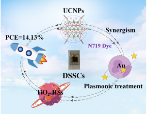 染料敏化太阳能电池(DSSCs)因其成本低、制备简单、光电转换效率较高等优点,成为极具应用前景的新一代光伏设备。目前,DSSCs器件已经实现了高达14.3%的光电转换效率,但是基于N719染料的DSSCs的光电转换效率仅为11.5%左右。鉴于此,本工作设计了一种包含P25纳米颗粒、TiO2空心球(TiO2-HSs)、Au纳米颗粒(AuNPs)和NaYF4:Yb,Er@NaLuF4:Eu@SiO2上转换纳米颗粒(Er@Eu@SiO2 UCNPs)的多功能复合光阳极材料,大幅提升了DSSCs的光电性能。该复合光阳极以P25为透明层,以TiO2-HSs和Er@Eu@SiO2 UCNPs为光散射层,显著拓宽了N719染料的吸光范围。通过简单的等离激元处理,在光散射层薄膜上原位生长AuNPs,进一步增强了N719的光吸收能力。在此,使用紫外光触发AuNPs的表面等离子体共振(SPR)效应,SPR场增强效应不仅加快了光阳极材料的反应进程,还促使UCNPs吸收更多的红外光。此外,AuNPs产生的晶体缺陷也阻止了电子与空穴的重组。研究表明,制备的多功能复合光阳极不仅具有良好的兼容性,还在模拟太阳光下收获了14.13%的光电转换效率,这是目前使用传统N719染料作为敏化剂的DSSCs的最高效率。值得注意的是,经过180 h的稳态测试后,电池的光电转换效率仍然保持95.33%,表现出良好的设备稳定性。这种多功能复合光阳极的独特设计为研究其多组分之间的协同作用机制以及开发具有广泛应用前景的新型光阳极材料提供了一种新的途径。