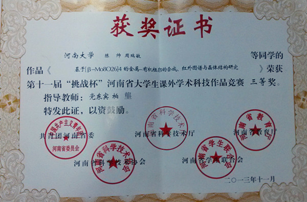 第七届挑战杯创业计划大赛”中,有11个项目入选校级,分别荣获一等奖1项,二等奖1项,三等奖2项,优秀奖7项,其中,由团委组织的“菲尔普科技有限责任公司”将代表学校参加省级竞赛。在“第十一届河南省挑战杯大学生课外学术科技作品竞赛”中该院陈帅、周瑞敏同学的作品荣获河南省三等奖。截止目前,该支部同学已发表论文十余篇,其中武贺臣同学SCI论文一篇(一作),胡晓静同学论文一篇(一作)已被chemcomm接收。另外,赵鹏辉等四名同学参与“新型无卤胶囊化阻燃剂研制”项目已通过了河南省科技成果鉴定。