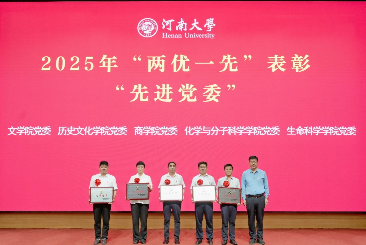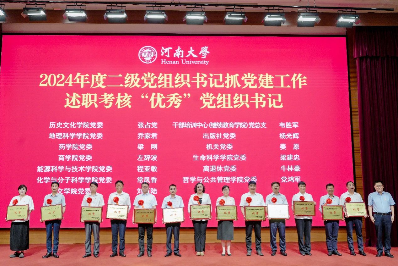 6月30日上午,在庆祝中国共产党成立104周年之际,河南大学2025年“两优一先”表彰大会暨党建引领基层高效能治理工作会议在图书馆一楼报告厅隆重召开。大会对2025年度先进党委、优秀共产党员、优秀党务工作者、先进党支部以及2024年度二级党组织书记抓党建工作述职考核优秀党组织书记、新闻宣传工作先进集体和个人予以表彰。