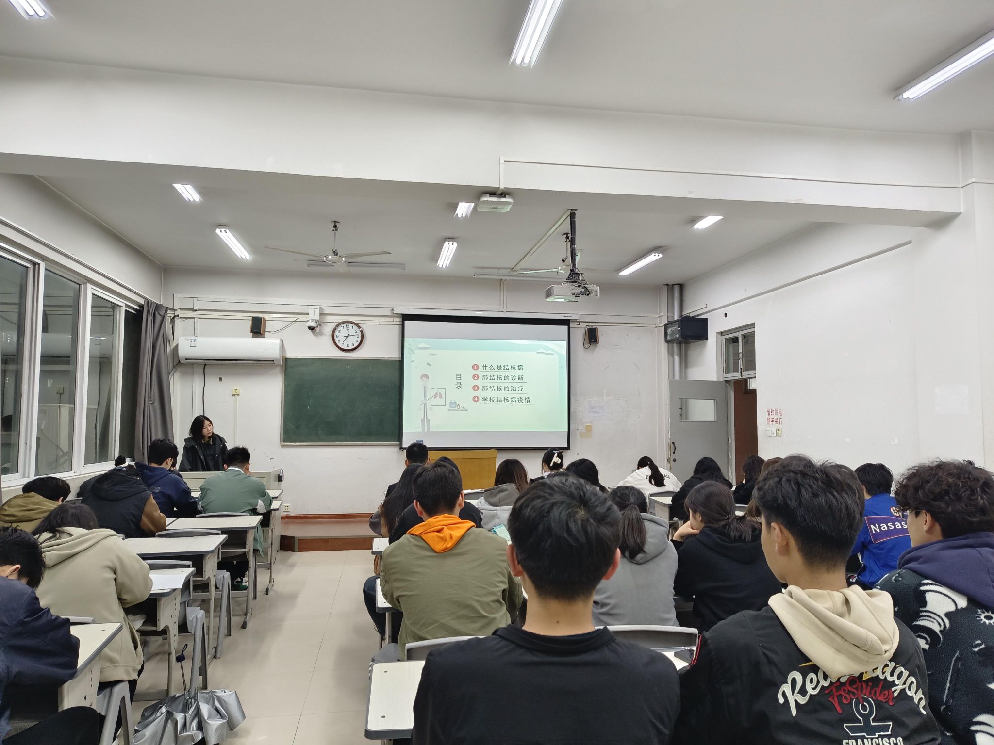肺结核是常见的呼吸道传染疾病,主要通过吸入肺结核患者咳嗽、打喷嚏时飞出的飞沫传播等。为进一步做好结核病防控工作,提高广大师生对结核病预防的认识,我院积极组织学生参加学校《肺结核防治知识师资培训》,随后回学院以“你我共同努力 终结结核流行”为主题,开展结核病防治知识宣传教育。